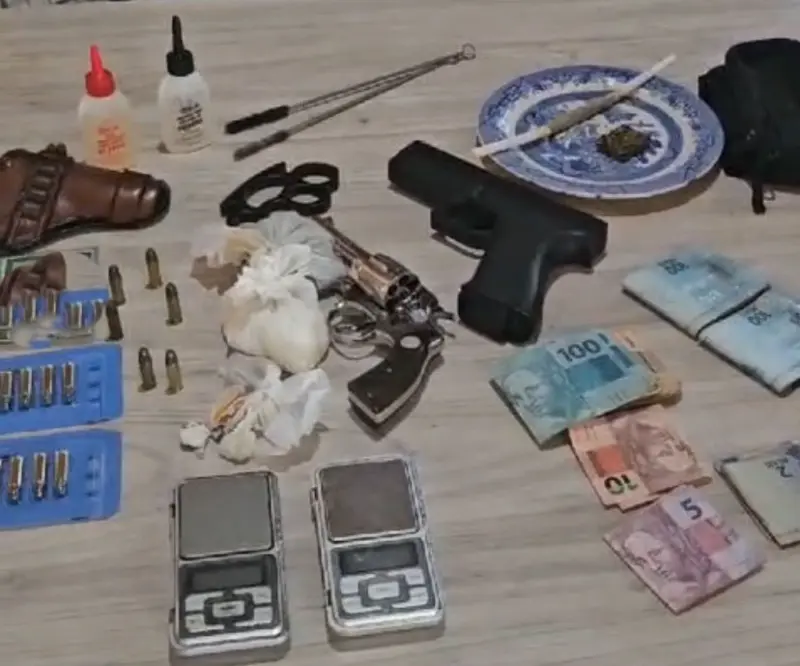 Em uma ação conjunta entre a Polícia Civil de Jacinto Machado, Turvo, Sombrio, Santa Rosa do Sul e Balneário Gaivota, durante a tarde foram realizados diversos cumprimentos de mandados de busca e apreensão. Na casa investigada no Bairro Araça, foi apreendido um menor, que tentou fugir no momento da abordagem, mas foi capturado pelos policiais militares. Além do menor, foi encontrado um revólver Taurus calibre 32, 31 munições, um simulacro de pistola, 85,1 gramas de crack, 34,8 gramas de maconha, 1 cigarro grande de maconha pesando 3,3 gramas, além de 2 petecas de crack separadas pesando 2,4 gramas. No local, foram também encontradas balanças de precisão, juntamente com a quantia de R$3.700,00 em notas diversas.