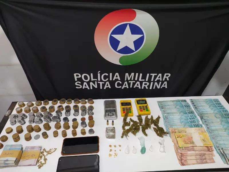 A PM foi até o apartamento do suspeito e iniciou as buscas, encontrando 33,5 gramas de maconha, 2,3 gramas de crack, 3,9 gramas de cocaína, além de uma balança de precisão, duas máquinas de cartão de crédito, a quantia de R$ 4.723,10 em dinheiro e um caderno com anotações. O suspeito foi preso em flagrante e encaminhado para a Delegacia de Polícia Civil de Sombrio, juntamente com todo o material apreendido.