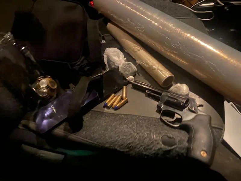 Durante as buscas na casa, a polícia encontrou um revólver calibre.38, municiado com cinco munições. Na sala, foram encontradas duas embalagens contendo uma quantidade considerável de cocaína, devidamente embaladas para comercialização, além de um torrão de maconha. Também foi encontrado um colete balístico preto com um suporte para arma de fogo.
