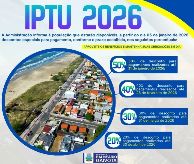 O Setor de Arrecadação da Prefeitura Municipal de Balneário Gaivota, informa que o boleto do IPTU estará disponível a partir do dia 01/01/26 no site da Prefeitura, www.balneariogaivota.sc.gov.br.