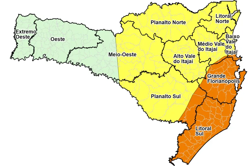 As regiões com risco mais alto para alagamentos e enxurradas são o sul do Vale do Itajaí, Grande Florianópolis, Litoral Sul e áreas da serra no Planalto Sul. Nesses locais, a chuva deve começar entre a noite de quarta e a tarde de quinta-feira, podendo ser forte e persistente.