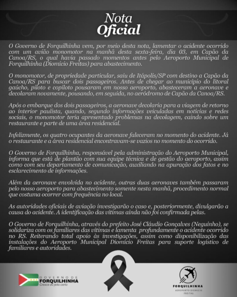 A Prefeitura de Forquilhina emitiu uma Nofa Oficial sobre o ocorrido, uma vez que a aeronave parou no aeroporto do município catarinense para abastecer.