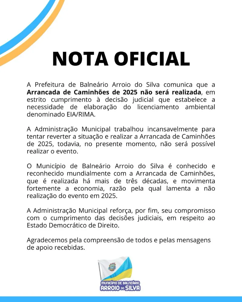 A Prefeitura de Balneário Arroio do Silva comunica que a Arrancada de Caminhões de 2025 não será realizada, em estrito cumprimento à decisão judicial que estabelece a necessidade de elaboração do licenciamento ambiental denominado EIA/RIMA.