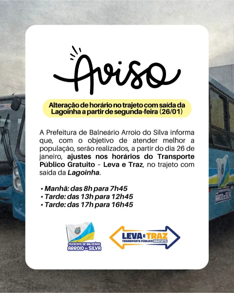 A Prefeitura de Balneário Arroio do Silva informa que, com o objetivo de atender melhor a população, serão realizados, a partir do dia 26 de janeiro, ajustes nos horários do Transporte Público Gratuito – Leva e Traz, no trajeto com saída da Lagoinha.
