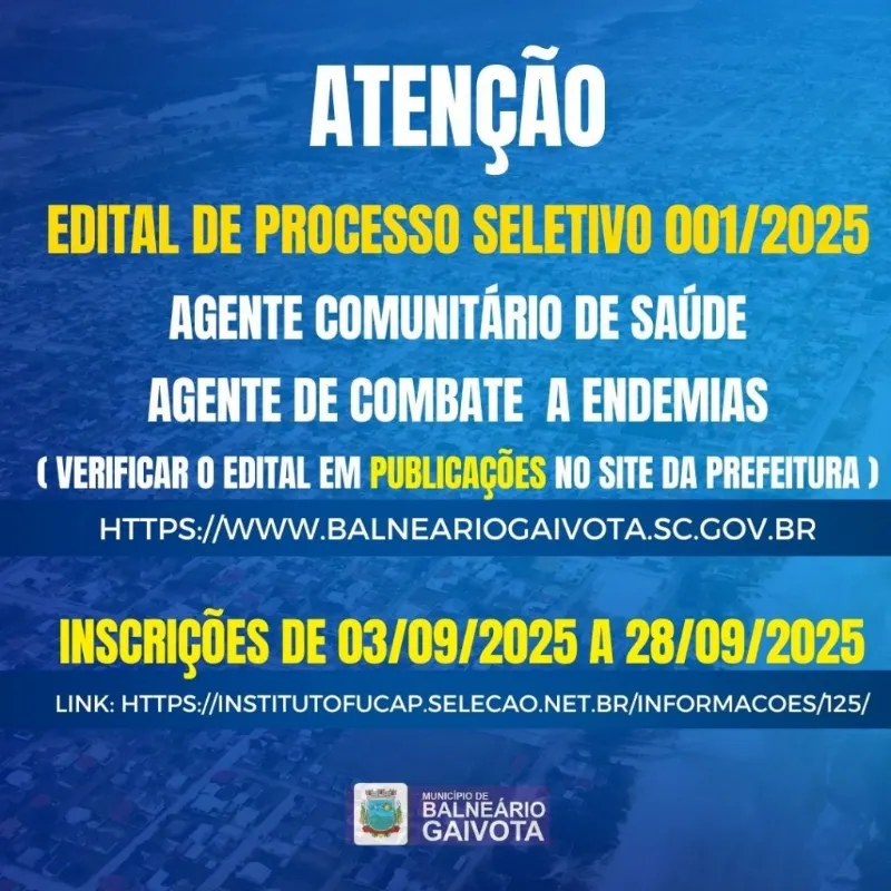 A Prefeitura Municipal de Balneário Gaivota, abriu inscrições para o Processo Seletivo nº 001/2025, para preenchimento dos cargos de Agente Comunitário de Saúde e Agente de Combate a Endemias.