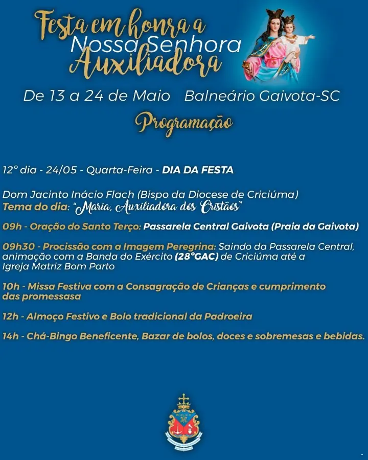 Em celebração ao Dia de Nossa Senhora Auxiliadora. A Santa é Padroeira da Paróquia Católica do Município. nesta quarta-feira, 24 de maio, será FERIADO MUNICIPAL, este é o terceiro ano em que o feriado é observado em Balneário Gaivota. Além das repartições públicas municipais, Prefeitura, Secretarias, Câmara de Vereadores, Escolas e demais órgãos públicos, bancos, Cartório e alguns comércios estarão fechados.