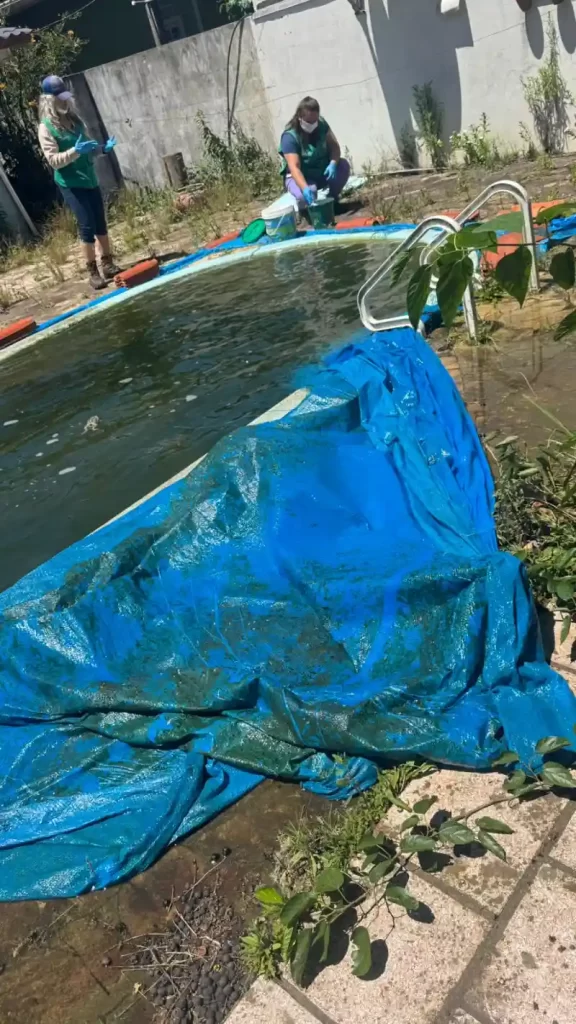 Infelizmente, a equipe encontrou uma piscina sem tratamento e em estado de abandono, que estava infestada de larvas do mosquito transmissor da dengue, zika e chikungunya. Este tipo de local, com água parada, é um ambiente ideal para a proliferação do Aedes aegypti.