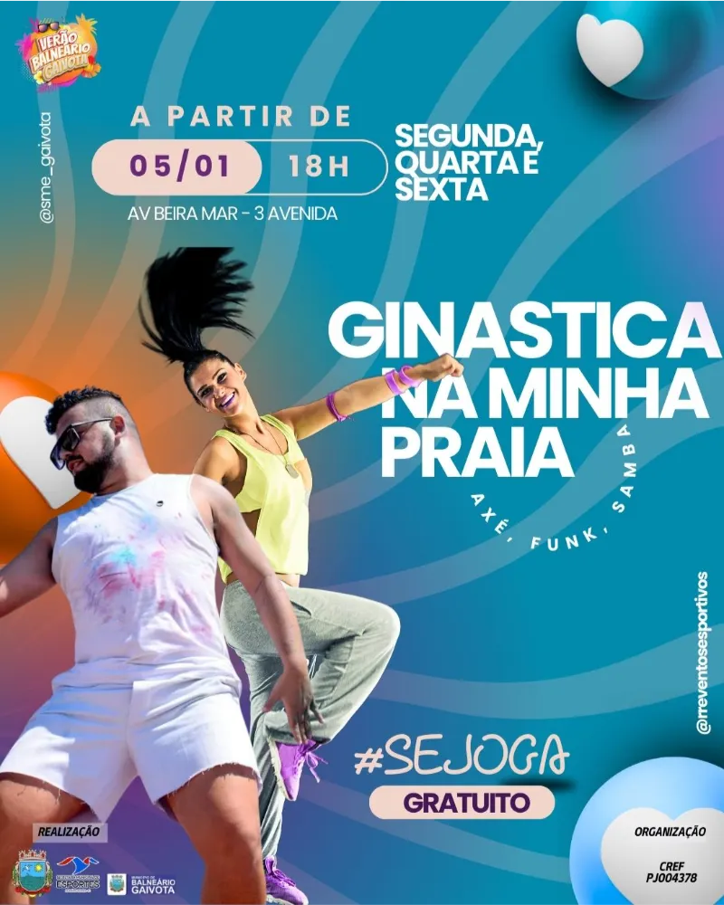 A Prefeitura Municipal em parceria com a @rreventosesportivos, dá início nesta segunda-feira (05), a partir das 18h, ao Projeto Ginástica na Minha Praia.