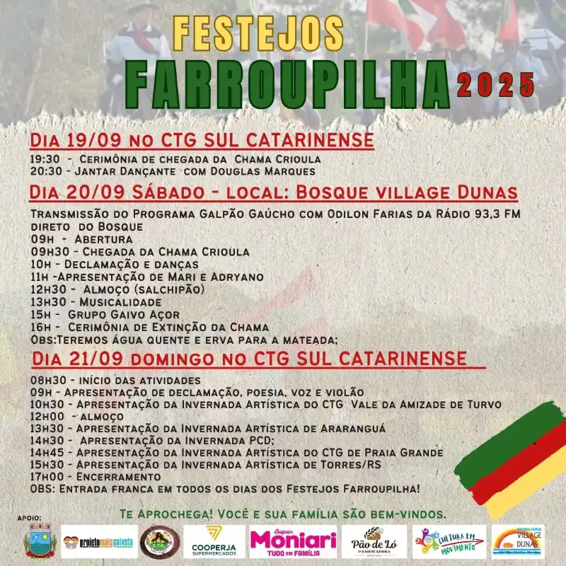 Para celebrar as comemorações da epopéia farroupilha, a Prefeitura Municipal, por meio da Secretaria de Turismo, Cultura, CTG SUL Catarinense, Projeto Mais Gaivota, Associação Cultura em Movimento, Grupo Village Dunas e entidades parceiras, realizam de 19 a 21 de setembro, os Festejos Farroupilha 2025.