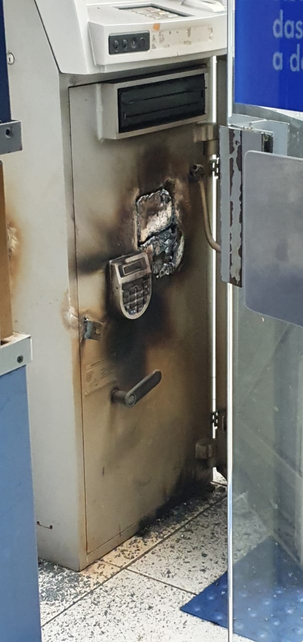 Os policiais militares imediatamente seguiram até o local onde foi constatado que a porta com fechadura eletrônica que dá acesso ao caixa eletrônico tinha sido arrombada com um ferro e os bandidos teriam tentado arrombar o caixa com o uso de uma maçarico, produzindo um forte cheiro de queimado e chamando atenção dos moradores. Quando os policiais chegaram no local os bandidos já tinham fugido.