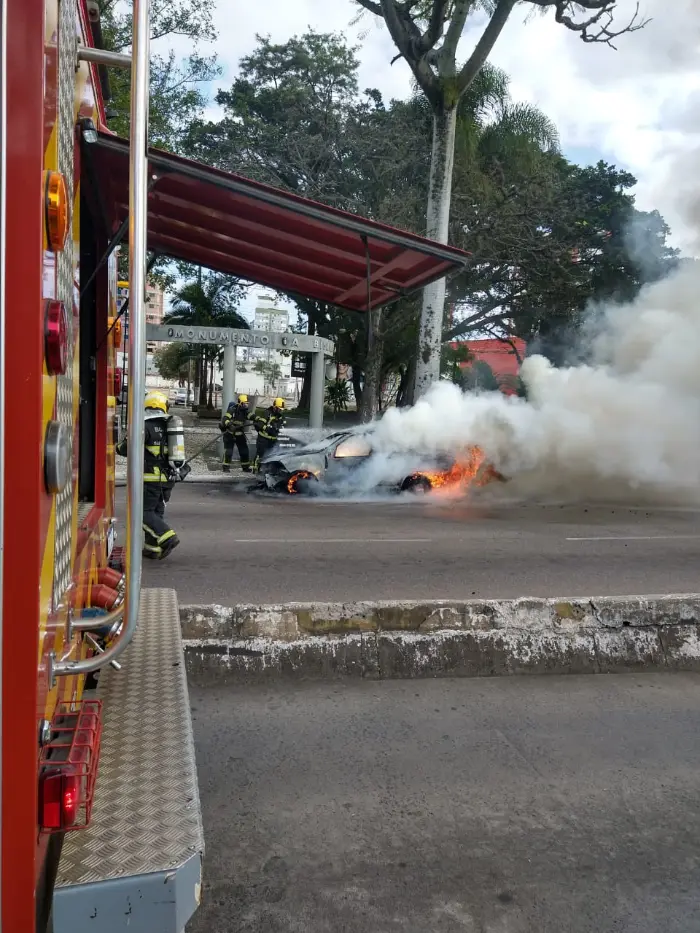 Um veículo Fiat Siena pegou fogo na tarde deste domingo, dia 02, em Criciúma. A ocorrência foi registrada na Avenida Centenário, no centro, às 15:17h.