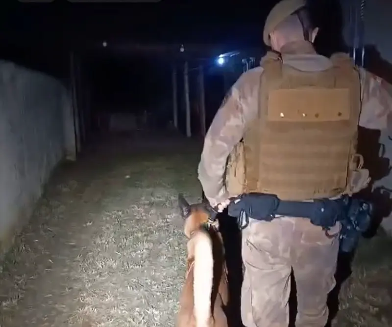 Durante as buscas realizadas pelo Canil, o cão farejador Argo localizou na casa: duas balanças; um rolo de plástico filme usado para embalar a droga, uma faca com resquícios de maconha e papéis com anotações. No terreno ao lado da residência, o cão encontrou uma bolsa contendo: 370 gramas de maconha, uma tesoura, 13 comprimidos de ecstasye um pote pequeno com resina de maconha.