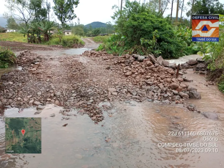 No município, 187 pessoas ficaram isoladas por causa do rompimento da via provisória, das 2hs às 9hs, após a Secretaria de Obras preparar uma passagem. “Tínhamos uma passagem provisória porque a comunidade aguarda a vinda de kit de transposição da Defesa Civil Estadual. No momento estamos dando todo o apoio necessário e enviamos o relatório de registro, repassando com cobrança a instalação dos kits de transposição da Defesa Civil Estadual que aguardamos ansiosamente”, contou o coordenador da Defesa Civil Municipal de Timbé do Sul, Evandro F. Amandio.