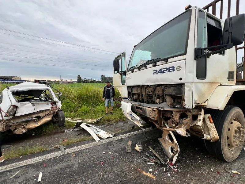 Segundo informações do Corpo de Bombeiros, a colisão envolveu um caminhão e dois VW Gol, deixando uma vítima presa às ferragens. As equipes de resgate realizaram o atendimento no local e prestaram os primeiros socorros.