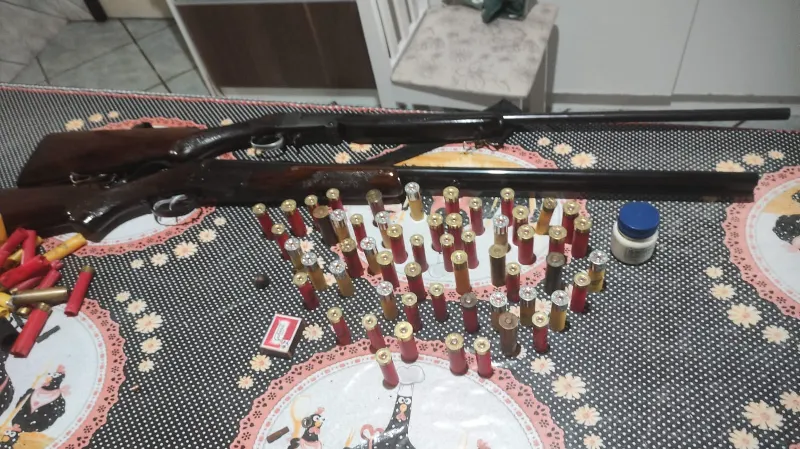 Durante as buscas, foram localizadas duas espingardas — uma de marca Beretta e outra de marca Boito — além de uma grande quantidade de munições.