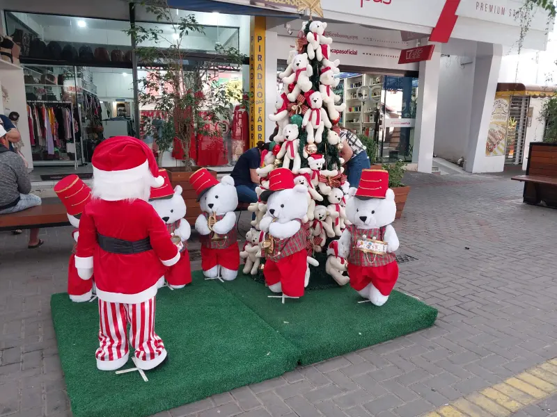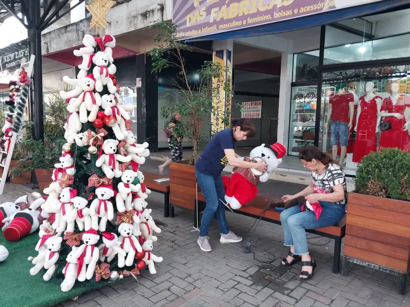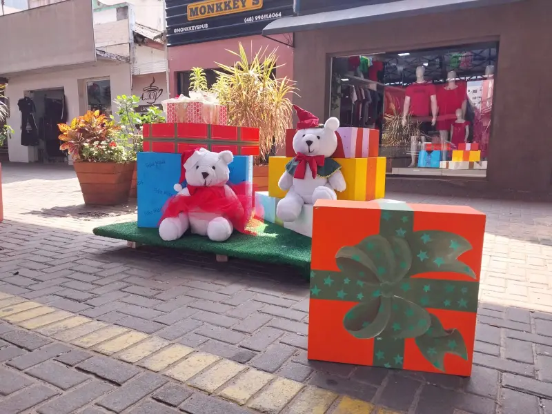 Renas puxando trenós, a banda de ursos orquestrada por ninguém menos do que o Papai Noel, presentes, árvores de natal e outros ricos elementos confeccionados pela Casa da Cultura de Sombrio estão embelezando ainda mais a Rua Coberta.
