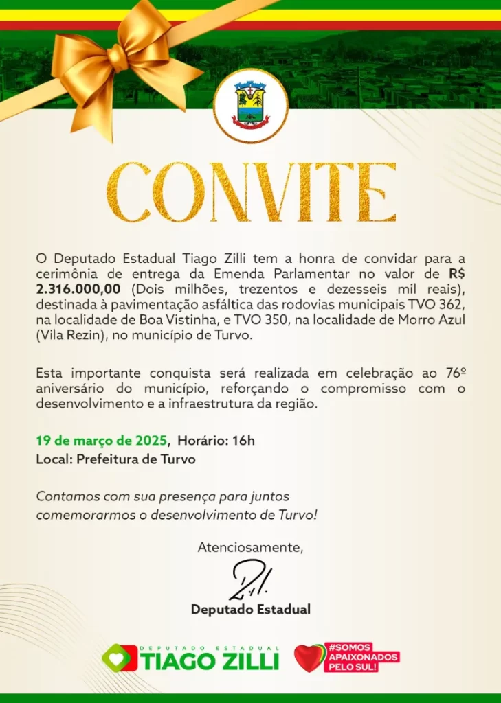 Para celebrar o aniversário de 76 anos de Turvo, o Deputado Estadual Tiago Zilli vai realizar a entrega da Emenda Parlamentar no valor de R$ 2.316.000,00 (Dois milhões, trezentos e dezesseis mil reais), destinada à pavimentação asfáltica das rodovias municipais nas localidades de Boa Vistinha e Morro Azul.