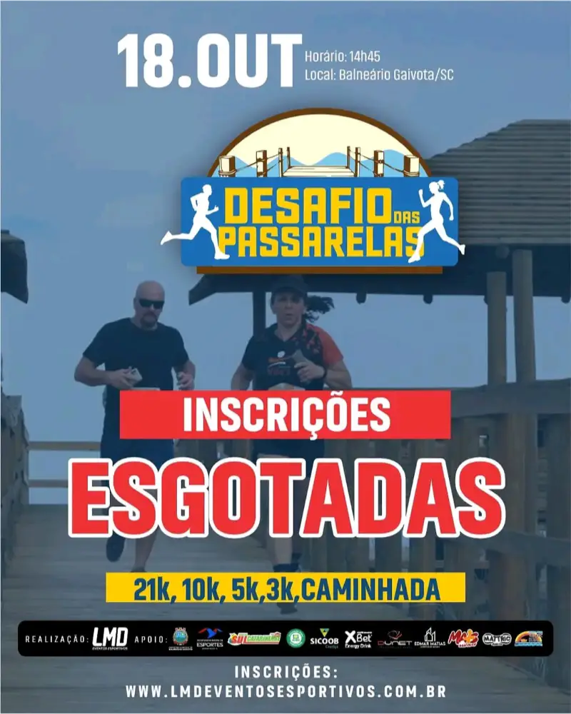 Inscrições esgotadas para o 2º Desafio das Passarelas, no dia 18 de outubro, em Balneário Gaivota. De acordo com a organização a procura superou as expectativas com 400 atletas inscritos em 5 categorias: 21k (meia maratona), 10k, 5k, 3k e caminhada. O desafio terá ainda a prova Kids.