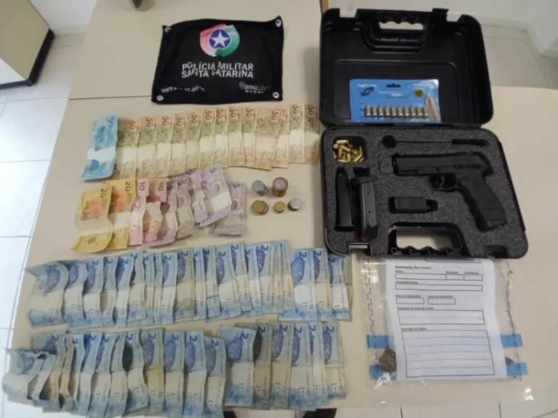 Na residência, com apoio do Canil K9 de Araranguá foram encontradas 6,48gr de maconha. Durante as buscas também foi encontrada uma pistola calibre 380 com três carregadores, 27 munições e um case de armazenamento, além de R$ 943,75 em dinheiro.