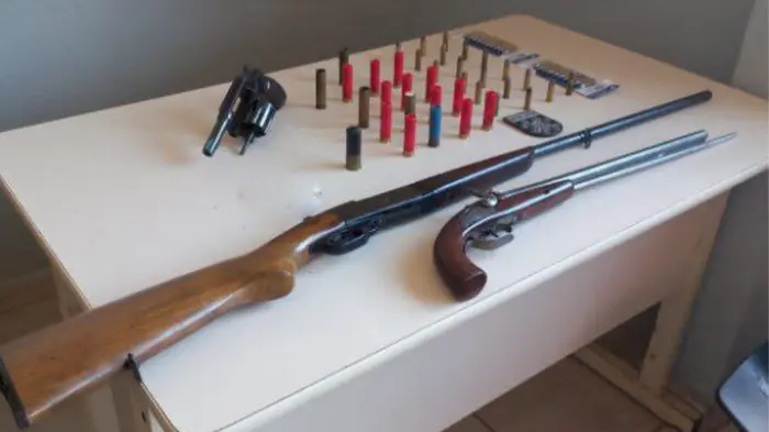 No local, os policiais abordaram o suspeito e quando questionado, relatou possuir duas armas de fogo, um revólver calibre .38 municiado com seis munições e uma espingarda calibre .28.