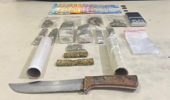 Durante a abordagem e as buscas na residência, os policiais localizaram 253,57 gramas de maconha, além de uma faca utilizada para fracionar a droga, papel filme e embalagens para acondicionamento, R$ 369,55 em dinheiro e um aparelho celular.