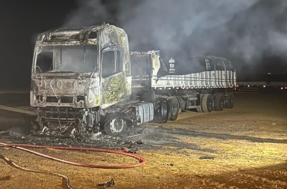 No local, os bombeiros encontraram um Volvo FH, carregado de arroz embalado para a venda, em chamas, em um terreno aberto de uma empresa, a aproximadamente 100 metros da via pública.