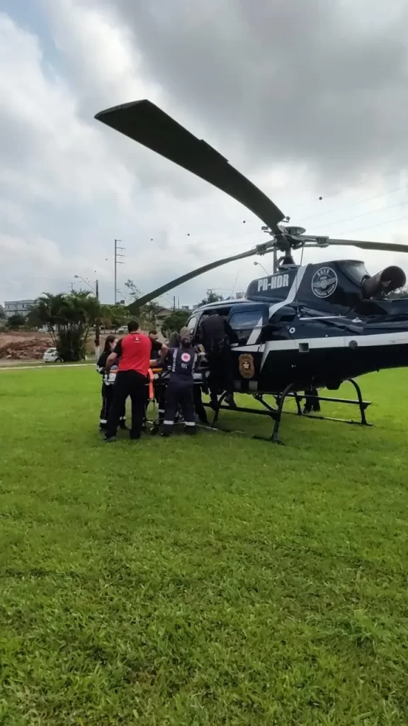 Dada a gravidade dos ferimentos e a necessidade de um atendimento especializado em trauma, o homem foi transportado de helicóptero até o Hospital São José, em Criciúma, reconhecido como referência na área.