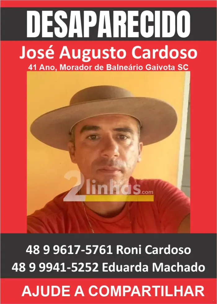 Roni Cardoso, irmão do desaparecido, informou que José Augusto Cardoso, de 41 anos, morador da Lagoa de Fora, em Balneário Gaivota, foi visto pela última vez no domingo. Desde então, não se teve mais informações sobre seu paradeiro, o que levou a família a iniciar uma grande busca na tentativa de obter pistas e encontrá-lo.