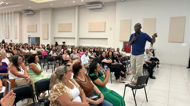 O evento contou ainda com a palestra de João Carlos de Oliveira, professor, palestrante e consultor empresarial nas áreas de qualidade de vida e liderança, formado em Artes Cênicas. De forma leve e bem-humorada, ele abordou os desafios do cotidiano dos profissionais da educação, arrancando boas risadas do público e proporcionando um momento de descontração, reflexão e acolhimento.