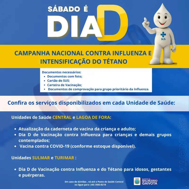 A secretaria municipal de Saúde de Balneário Gaivota, por meio da Vigilância Epidemiológica, informa que neste sábado 13 de abril, realiza “Dia D” da campanha nacional de vacinação contra a influenza e intensificação do tétano.