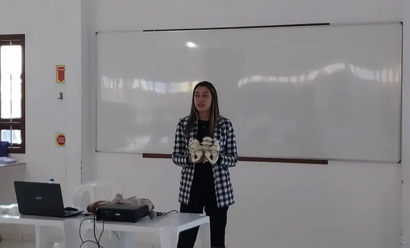 A tarde se iniciou com a fisioterapeuta pélvica, que deu orientações sobre exercícios para facilitar o parto, com demonstrações de peças anatômicas para uma melhor compreensão do grupo. Depois foi a vez da enfermeira obstétrica, que desfez com as gestantes diversos mitos que cercam a amamentação, como a preparação das mamas para a chegada do bebê.