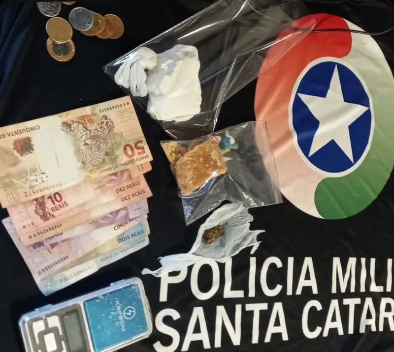 Durante as buscas, a Polícia Militar dirigiu-se à residência de onde o homem havia saído e abordou outro suspeito, que resistiu à abordagem e precisou ser algemado. Os policiais realizaram uma busca na casa, encontrando drogas no lixo do banheiro, dinheiro sobre a mesa, drogas prontas para venda, uma balança de precisão e diversos produtos de procedência duvidosa, tais como um fogão industrial, uma motosserra, um micro-ondas, um botijão de gás, um motor de poço, além de uma caixa de entregador de moto e um capacete. O suspeito abordado recebeu voz de prisão e foi conduzido à Delegacia de Polícia Civil de Araranguá.