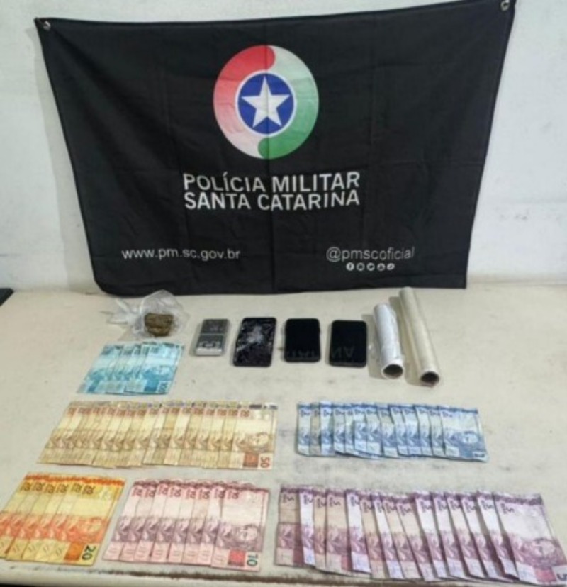 Durante as buscas, os policiais localizaram uma porção de substância análoga à maconha, com aproximadamente 50 gramas, escondida em um armário da cozinha, além da quantia de R$ 1.801,00 em dinheiro. Também foram apreendidos três aparelhos celulares, uma balança de precisão, um rolo de papel insulfilm e uma embalagem plástica, materiais comumente associados ao tráfico de drogas.