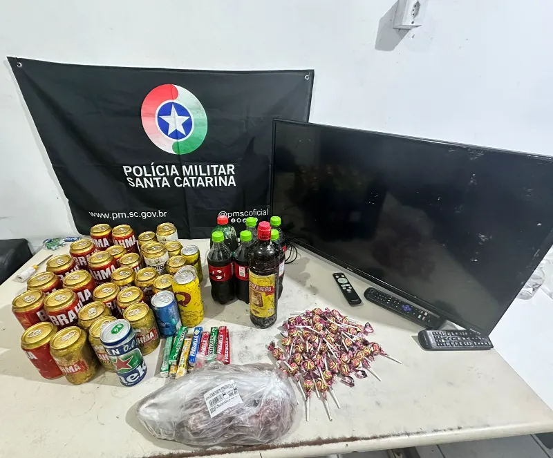 Foram recuperados diversos itens furtados, entre eles bebidas, doces, refrigerantes, uma peça de carne tipo filé mignon e uma televisão da marca Philco.