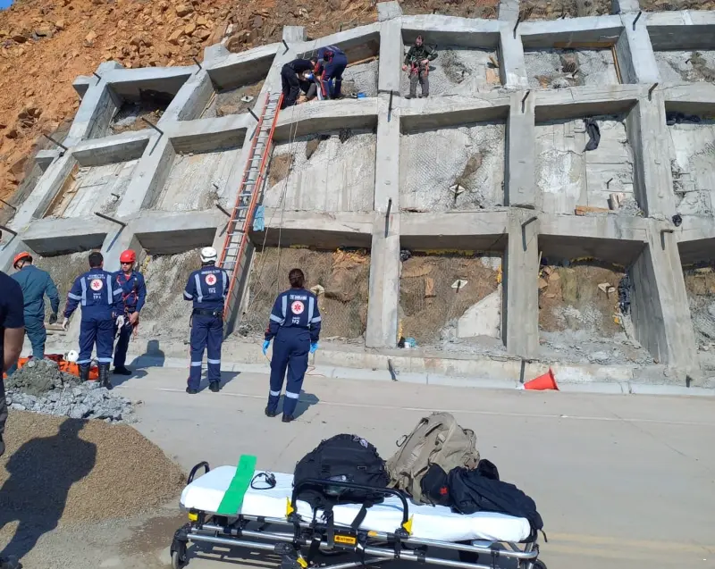 A vítima, um homem de 30 anos, estava utilizando os equipamentos de segurança adequados quando um dos pinos de fixação apresentou problemas, resultando na queda. O resgate envolveu múltiplas técnicas de salvamento em altura e analgesia para a correta locomoção do paciente.