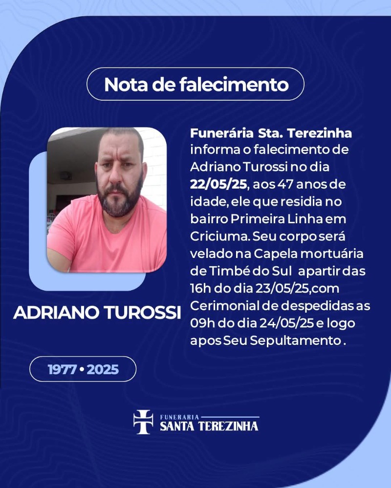 A Funerária Santa Terezinha comunica o falecimento de Adriano Turossi, ocorrido no dia 22/05/2025, aos 47 anos de idade. Residente no bairro Primeira Linha, em Criciúma, Adriano será velado na Capela Mortuária de Timbé do Sul a partir das 16h do dia 23/05/2025. O cerimonial de despedida ocorrerá às 9h do dia 24/05/2025, seguido do sepultamento.