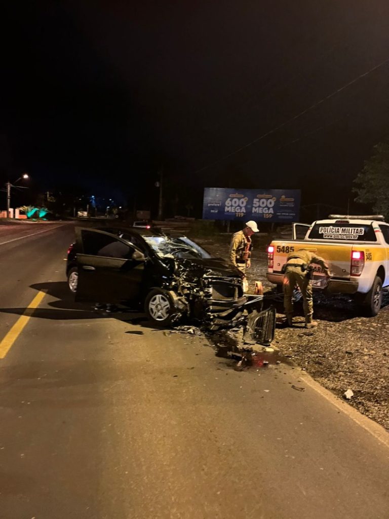 A colisão frontal envolveu um carro e uma motocicleta, mobilizando a equipe de resgate do Corpo de Bombeiros Militar de Turvo, com a viatura Auto Socorro de Urgência (ASU-425).