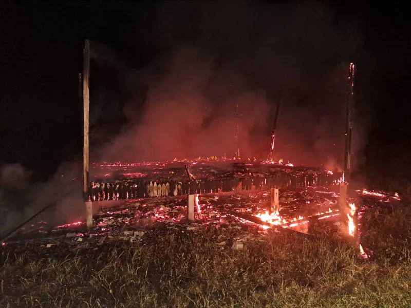 Conforme os bombeiros, o fogo já se encontrava em fase de diminuição, porém a estrutura foi praticamente consumida pelas chamas, com paredes e assoalho totalmente destruídos.