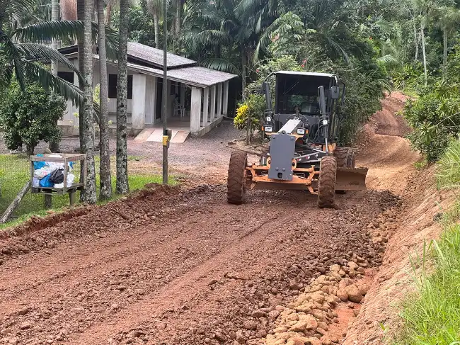 Máquinas na pista! O alerta é para motoristas que trafegam pela estrada que liga a comunidade de Cotovelo, em Jacinto Machado, até Linha Tamandaré, no limite entre os municípios de Santa Rosa do Sul e Sombrio.