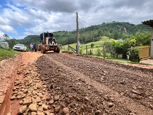 Máquinas na pista! O alerta é para motoristas que trafegam pela estrada que liga a comunidade de Cotovelo, em Jacinto Machado, até Linha Tamandaré, no limite entre os municípios de Santa Rosa do Sul e Sombrio.