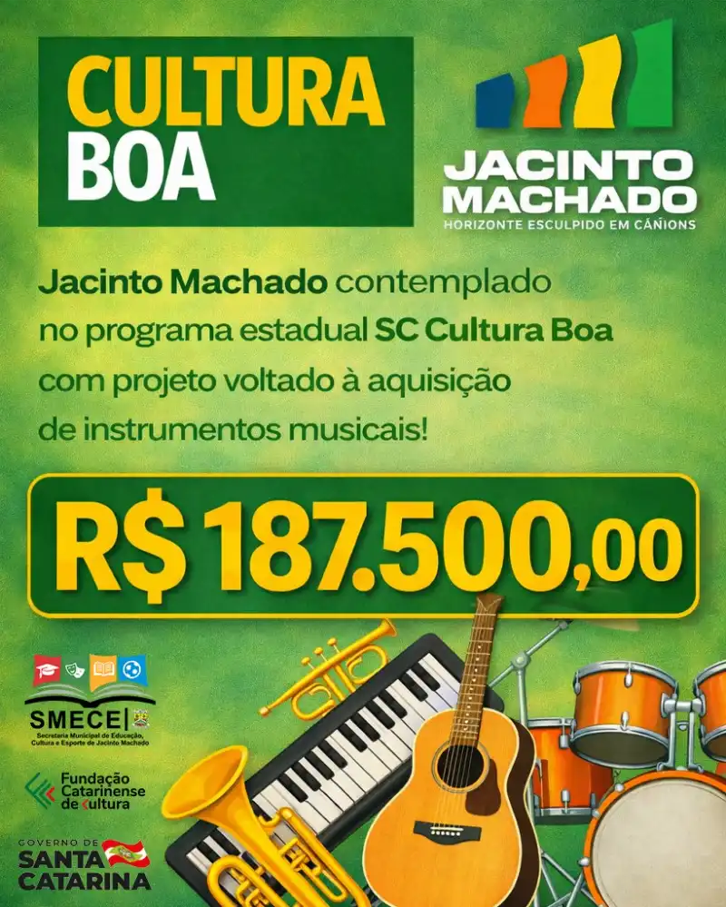 A Fundação Catarinense de Cultura (FCC) divulgou a lista dos municípios contemplados no Edital SC Cultura Boa, iniciativa do Governo do Estado de Santa Catarina. Entre os selecionados está o município de Jacinto Machado, que receberá recursos destinados à aquisição e manutenção de instrumentos musicais.