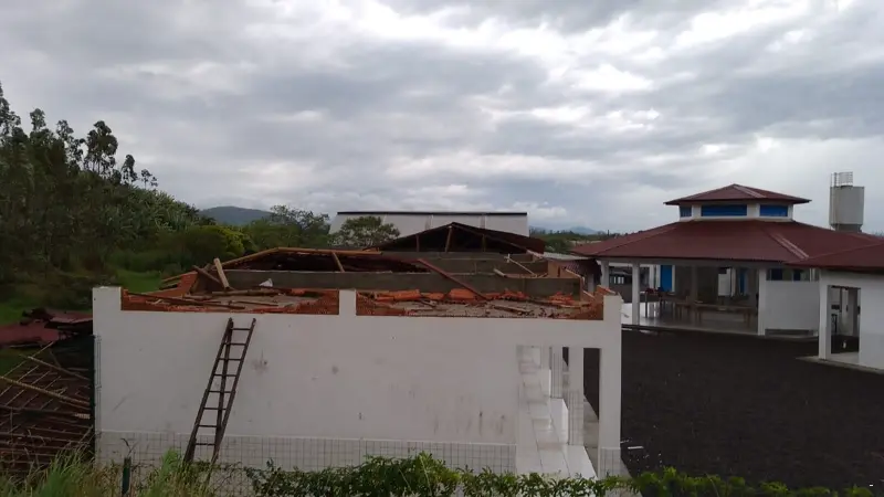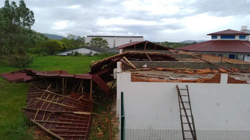 Intempérie climática que assolou o extremo sul catarinense na tarde deste sábado, 11 de novembro, resultou em prejuízos relevantes para o poder público de Jacinto Machado, além de casas destelhadas e lavouras afetadas pela ventania. Uma escola teve arrancado o telhado de algumas salas de aula e até a decoração natalina foi afetada.