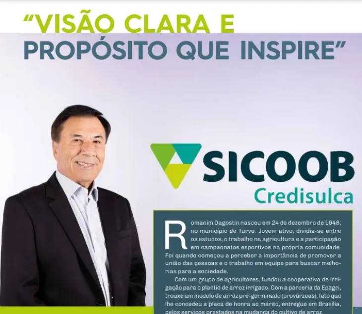 Na revista estadual “Lideres de expressão”, duas personalidades do Sul Catarinense e da nossa região ocupam as páginas, Vanir Zanatta, Presidente da Cooperja e da Ocesc e Romanin Dagostim, Presidente do Sicoob Credisulca. Justa homenagem, parabéns!