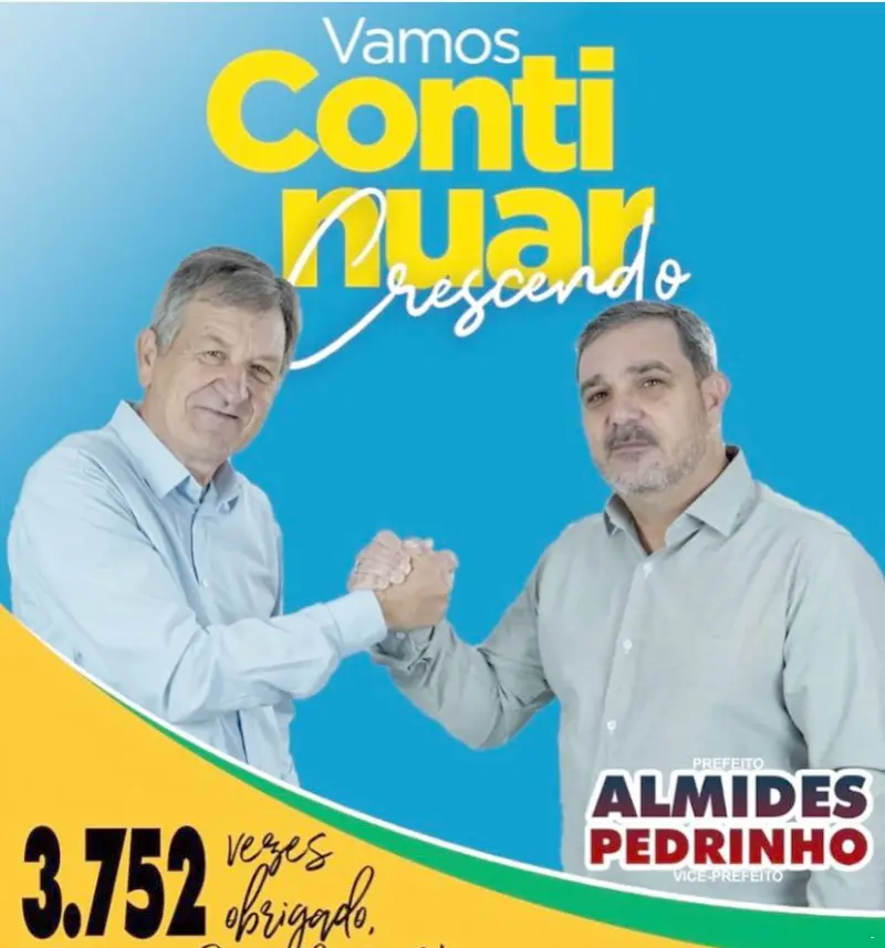 Prefeito e vice reeleito Almides da Rosa e Pedrinho Ávila, estão organizando a festa da vitória para este domingo dia 27 as 12h34 no Parque Municipal de Eventos. O horário é para justificar a diferença de votos entre Almides e o Nelson que foi de 1.234 votos. Almides foi reeleito com, 59,84% dos votos. O seu partido o PSDB fez três vereadores, o MDB do vice elegeu também três vereadores.