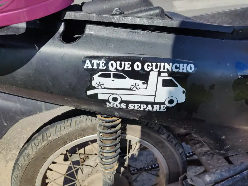 Um adesivo na moto já previa o futuro do veículo. onde dizia: “Até que o guincho nos separe!”