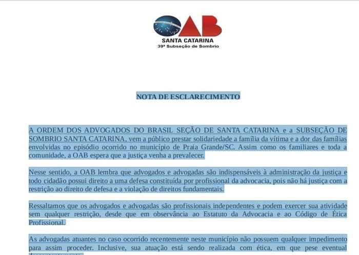 A ORDEM DOS ADVOGADOS DO BRASIL SEÇÃO DE SANTA CATARINA e a SUBSEÇÃO DE SOMBRIO SANTA CATARINA, vem a público esclarecer que as advogadas atuantes no caso ocorrido recentemente no município de Praia Grande não possuem qualquer impedimento para assim proceder. Inclusive, a atuação está sendo realizada com ética, em que pese eventual descontentamento.