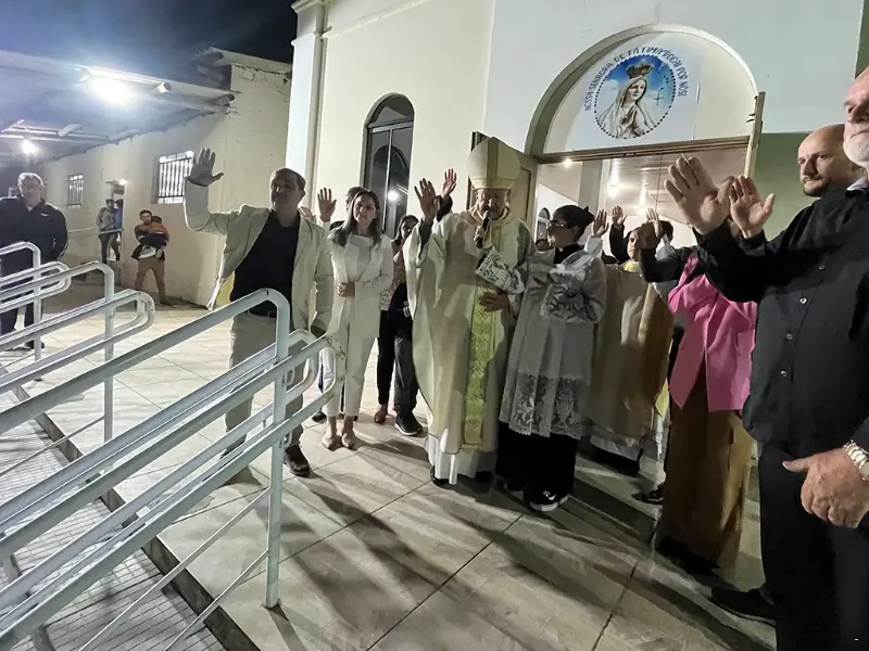 Na noite da última sexta-feira, 29 de setembro, moradores de Jaguarari se reuniram na igreja de Nossa Senhora de Fátima para uma solenidade que marcou a inauguração de uma nova praça na comunidade, totalmente revitalizada, com drenagem especial, pavimentação com lajotas, sinalização horizontal, iluminação e ainda uma área infantil. “Algo que nos preocupava aqui no Jaguarari era a drenagem. Por se tratar de um terreno íngreme e onde estão localizadas a escola, igreja e salão comunitário, demos uma atenção especial ao projeto, de modo a trazer segurança a todos, mas também embelezar este ponto público e central da comunidade”, explicou o prefeito Almides Roberg da Rosa, que descerrou a placa inaugural ao lado do bispo e demais lideranças municipais.