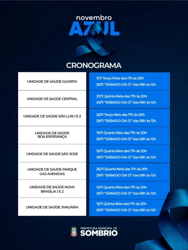 Cada unidade terá dias e horários ampliados para consultas, orientações e realização de exames, garantindo que ninguém fique de fora. E no dia 29 de novembro, acontece o nosso “Sábado Dia D”, com atendimento das 08h às 12h em todas as unidades participantes.