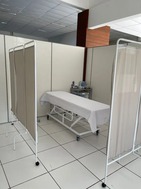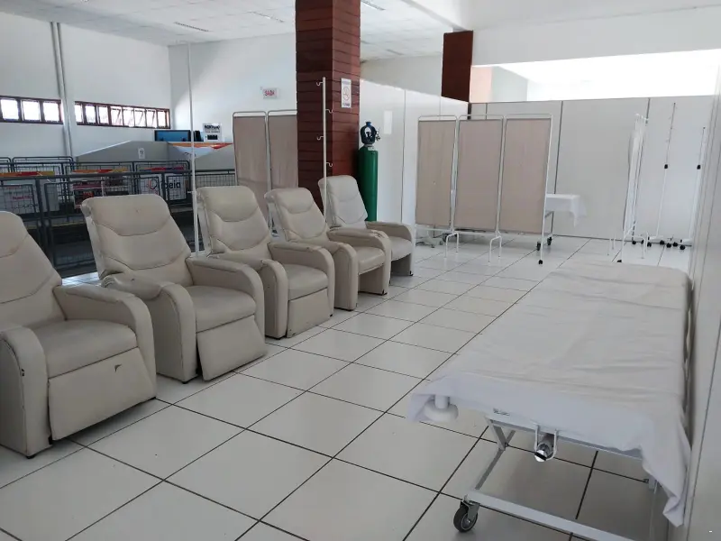 Além da recepção dos pacientes, há salas de triagem, de procedimentos e de emergência, além de poltronas, macas, farmácia e demais insumos para atender à população, por ordem de prioridade.