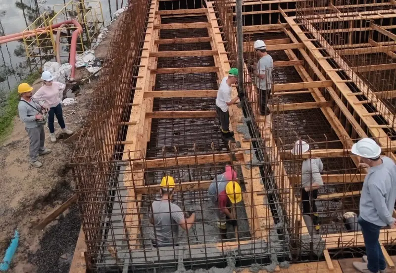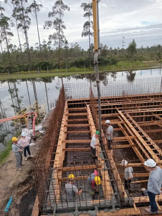 Mais um passo importante na instalação da nova Estação de Tratamento de Água em Balneário Gaivota foi dado nesta segunda feira, dia 17, com a concretagem da primeira etapa da nova caixa de contato da ETA, responsável por receber a desinfecção e fluoretação da água tratada, para posterior distribuição para a cidade. Foram utilizados seis caminhões betoneira com 9m³ cada, totalizando 54m³ de concreto. Foi concretado 1,10m de paredes e toda a laje de fundo da caixa de contato.